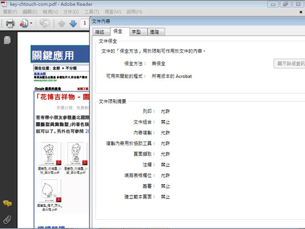 首頁線上工具檔案管理 Free PDF Unlock Online Utility (Beta) 線上移除 PDF 文件的列印、複製與貼上保全設定 對於有設定列印、複製與貼上保全的 PDF 文件,可透過 Free PDF Unlock Online Utility (Beta) 這個免費的線上服務來將其保全移除,使用方式非常簡單,只需將需要解除保全的 PDF 檔案上傳給 Free PDF Unlock Online Utility (Beta),接下來就會下載一份已解除保全設定的 PDF 檔案,上傳的 PDF 檔案大小不得超過 5 MB 。 🔔 不錯過任何精彩! 立即訂閱我們的 LINE 官方帳號 每次發佈新文章時,您將會第一時間收到本站文章連結通知,輕鬆掌握最新資訊! 使用 LINE 追蹤文章更新 §相關文章,還可以參閱:VERT:開源本地端檔案格式轉換器,隱私優先的免費瀏覽器轉檔工具PageSplitty 線上 PDF 分割轉 JPG、PNG、WebP 圖工具,支援 5GB 大小的大檔案PixDuplicate:免上傳快速找出並刪除重複照片的免費線上工具Adapter:全方位影片、音檔及圖片格式轉換免費軟體,支援影片轉音檔與圖片,音檔及圖片格式互轉TextCompare 線上比較 Excel、PDF 及圖片,快速找出檔案不同之處 如何使用 Free PDF Unlock Online Utility (Beta)的線上服務? 1.進入 Free PDF Unlock Online Utility (Beta) 網站後,將[I accept the terms and conditions]勾選,點擊[選擇檔案]來挑選要解除保全的 PDF 檔案,確定之後,點擊[Submit],稍後便可下載移除完成的 PDF 檔案,若瀏覽器有支援 PDF 閱讀器可直接開啟時,便會自動開啟在網頁上。 2.先來看已設保全的 PDF 文件,該份文件目前被禁止列印及內容複製。 3.經過 Free PDF Unlock Online Utility (Beta) 處理過的 PDF 檔案,讀者可自行比較下兩份文件內保全設定的差別。 Free PDF Unlock Online Utility (Beta)網站網址:http://www.ensode.net/pdf-crack.jsf