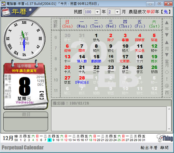 首頁電腦軟體生活資訊 X-Calendar2 民國 1 - 120 年國曆與農曆之日月曆程式並可輸出 Excel 年曆(免安裝) X-Calendar2 是一套民國 1 - 120 年國曆與農曆之日月曆並可輸出 Excel 年曆免安裝程式,簡單好用。 🔔 不錯過任何精彩! 立即訂閱我們的 LINE 官方帳號 每次發佈新文章時,您將會第一時間收到本站文章連結通知,輕鬆掌握最新資訊! 使用 LINE 追蹤文章更新 §相關文章,還可以參閱:Opal 可自由混搭雨聲、風聲、交通聲...等 17種環境音播放器地牛Wake Up! - 電腦版的地震速報免安裝「姓名吉凶分析」輸入姓名就幫你分析吉凶Complete Anatomy 使用 3D 了解人類身體結構樂透選號機 - 大樂透、樂透彩、今彩 539、樂線 9宮格號碼產生器(免安裝) 如何使用 X-Calendar2? 1.下載後,解壓縮,執行「pCalendar137.exe」便可開啟,開啟後,點擊[民國]與[月]下拉來選擇年、月即可。 2.若要輸出 Excel (電腦需有安裝 Excel 應用程式),點擊右下角的輸出年曆,選擇要使用的 Title 圖片(可不需要),設定節日、假日所要代表的顏色後,點擊右下角的[年曆輸出 Excel]。 3.輸出後的 Excel 2011 年年曆。 X-Calendar2版本:1.37語言:繁體中文性質:免費適用:Windows官方網站:http://www.cthing.idv.tw/product/XCalendar2/下載: 按我下載 若官網無法下載,可至本篇文章結尾處,點擊[檔案下載]