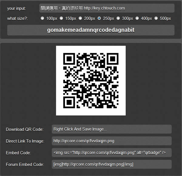 首頁線上工具生產力工具 QRcore.com 實用的線上QR Code 產生器,可以是任何文字、電話號碼、網址、EMail... 目前所看到的線上免費的 QR Code 產生器,通常都有限定一些格式,例如只能輸入電話號碼或是 URL,像是Kaywa QR-Code Generator 線上免費產生 QR Code 並附 URL 連結 或 qrbadge.com 網址 QR Code 產生器,提供五種尺寸,並支援外連 ,而 QRcore.com 就顯得較為實用些,不限定輸入格式,可以輸入任何文字、電話號碼、網址、EMail...等等,且產生後的 QR Code 還提供 100px、150px、200px、250px、300px、400px 及 500px 等尺寸的可下載、外連(Direct Link To Imag、Embed Cod 及 Forum Embed Cod) QR Code PNG 格式圖形。 🔔 不錯過任何精彩! 立即訂閱我們的 LINE 官方帳號 每次發佈新文章時,您將會第一時間收到本站文章連結通知,輕鬆掌握最新資訊! 使用 LINE 追蹤文章更新 §相關文章,還可以參閱:OpenAI 在 ChatGPT 中測試廣告|哪些帳戶受影響、廣告運作原則一次看在蝦皮當賣家,商品如何定價?手續費、免運、稅金怎麼算?蝦皮手續費計算機幫你全搞定!Google AI Plus 降到 260 元對決 ChatGPT Go!誰的功能更值得訂閱?ChatGPT Go 月付 290 元值得嗎?免費版、Plus 完整比較用 AI 做出的電影,YouTube 就看得到!一起來欣賞這部贏得百萬美元的突尼西亞短片《Lily》 如何使用 QRcore.com 所提供的服務來產生 QR Code? 1.進入 QRcore.com 網站後,在 your input 處,只要輸入要產生 QR Code 的任何文字、電話號碼、網址、EMail...等,在 what size? 處,可選擇 QR Code 的圖片大小,輸入好之後,點擊[gomakemeadamnqrcodedagnabit],便會在其底下產生相對應的 QR Code,並產生相關的外連的網址。 2.實例。 QRcore.com網站網址:http://qrcore.com/