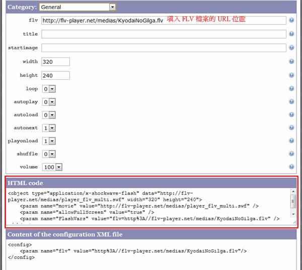 首頁線上工具影音視聽 flv-player.net 線上免費建立可應用在網頁裡的 Flash - FLV 檔案播放器 應用可在網頁裡播放的 Flash 有 2 種格式,一種是 SWF,若是存放在自己的電腦裡的 SWF 檔案,只要用瀏覽器像是微軟的 Internet Explorer 或是 Google Chrome 便可直接播放,另外一種則是 FLV 的檔案格式,若是存放在自己的電腦裡的 FLV 檔案,需要使用可播放 FLV 影音播放器來播放,像是 Splayer - 射手播放器、VLC Media Player 及 KMPlayer 等,但若想將自己的 FLV 影音分享到網頁上,可透過像是 Youtube 或無名影音的免費服務也可以做得到,若想是發佈到自己的網站,就需要將 Flash - FLV 綁定到網頁 FLV 播放器內,flv-player.net 就是一個免費提供可應用在網頁裡的 Flash - FLV 檔案播放器,共有 5 種樣式的播放器可供選擇,透過簡單的設定,便可在自己的網頁裡產生 FLV 檔案播放器,供造訪網站的訪客,直接在網頁裡播放。 🔔 不錯過任何精彩! 立即訂閱我們的 LINE 官方帳號 每次發佈新文章時,您將會第一時間收到本站文章連結通知,輕鬆掌握最新資訊! 使用 LINE 追蹤文章更新 §相關文章,還可以參閱:sound&go 耳機測試工具:免安裝測左右聲道、頻率響應Veo 3.1「材料轉影片」功能升級:支援直式影片與 4K 畫質來了!OpenAI Sora Android 版上線 Google Play,台灣用戶同步開放Google 親授 Veo 3.1 用電影語言與音效設計打造完美 AI 影片Sora Watermarker:一鍵為影片加上 OpenAI Sora 浮水印 如何使用 flv-player.net 產生網頁裡的 FLV 檔案播放器? 1.進入到 flv-player.net 網站後,就可看到所提供 5 種樣式的播放器,前三種播放器相差不多,後兩種的播放器功能選項較多,建議每種都可試看看,然後選擇一個適合自己網站的播放器。例如,點擊[MULTI]。 2.接下來可預覽播放器的樣式,點擊[Generator]。 3.在所出現的頁面,開始填入播放器的設定,預設的 flv 檔案,是由 flv-player.net 所提供,可填入自己所存放在網站上的 flv 網址,若想設定更多,可點擊[Category]下拉更多的設定選項,最後只要將 HTML Code 內的網頁內嵌程式碼複製,貼到自己的網頁裡便完成。 flv-player.net網站網址:http://flv-player.net/