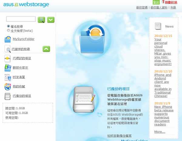 華碩大廠也來搶搭雲端商機,推出 ASUS WebStorage 的雲端電腦檔案儲存、同步及分享服務,免費的用戶有 1G 的空間可以使用,且推廣期間,還推出獎勵計畫,每推薦一位朋友加入,便可額外獲得 512MB 的空間,最高 10G。ASUS WebStorage 同樣推出可在 Windows 管理檔案的客戶端軟體,只要下載並安裝後,就如同在檔案總管裡多出一顆硬碟,隨時自由的存取、同步到多台電腦及分享的功能。