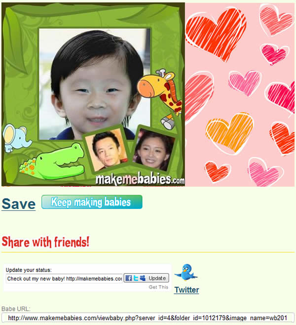 首頁線上工具影像繪圖 MakeMeBabies 想知道汪小菲與大S將來出生的寶寶模樣嗎? MakeMeBabies 是個相當有趣的網站,可上傳自己與對方的相片後,然後再選寶寶的性別以及人種,就會幫你合成出將來寶寶的樣貌,若是單身,MakeMeBabies 也提供明星的照片供你預測。 🔔 不錯過任何精彩! 立即訂閱我們的 LINE 官方帳號 每次發佈新文章時,您將會第一時間收到本站文章連結通知,輕鬆掌握最新資訊! 使用 LINE 追蹤文章更新 §相關文章,還可以參閱:跟著做就會!教你用 ChatGPT 製作具職業形象的漫畫風頭像Put!所見即所得的 AI 提示詞圖庫:讓你看著範例圖,複製就能做出同級作品Google 親自示範:Nano Banana AI 圖像編輯工具的 13 個熱門玩法照片角度不滿意?AI 幫你調整!3D Camera Control 讓舊照片任意變換視角Meta AI 免費帳戶也能用 Midjourney!無限生成 AI 圖片,台灣可用 如何使用 MakeMeBabies? 1.進入 MakeMeBabies 網站後,點擊[瀏覽]來選擇要上傳的相片,選擇好之後,點擊[go] 2.使用滑鼠調整相片上的臉部位置後,點擊[Next]。 3.點擊[Upload partner's Photo]選擇上傳另一伴侶的相片,若無合適的相片可點擊[Make babies with celebs]選擇由網站所提供的明星照片來合成。 4.點擊[瀏覽]來選擇上傳照片,選擇好之後,點擊[Upload Photo!]來上傳。 5.同樣的調整臉部位置,調整好之後,點擊[Next]。 6.接下來選擇相框,寶寶性別、人種、姓名後,點擊[Proceed]來產生。 7.接下來當然就是給他生出來囉! 8.寶寶模樣。 MakeMeBabies網站網址:http://www.makemebabies.com/