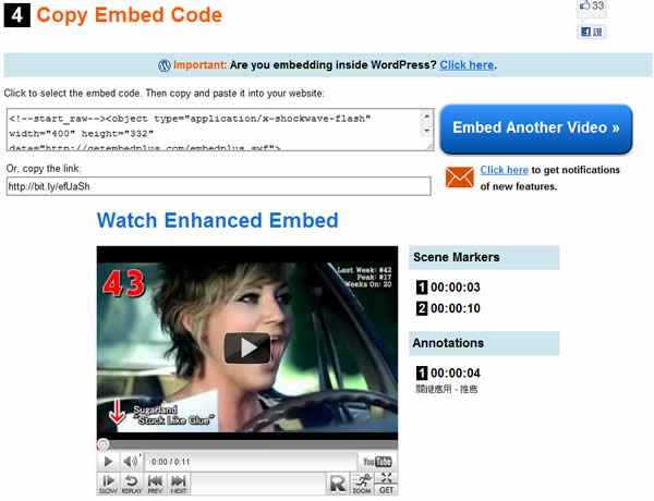 首頁線上工具網頁瀏覽 EmbedPlus 讓 Youtube 影片播放時,加入慢動作播放、重新播放、在原框架影片放大播放等功能 若喜歡將 Youtube 的精彩影片嵌入到自己的網頁或部落格內,現在可以透過 EmbedPlus 將該影片,在保有原本的 Youtube 播放功能之外,另外加入更多像是慢動作播放、重新播放、設定播放的開始時間、段落或是在原播放框架內加入影片放大播放等功能,提供造訪網站的訪客,更優質、貼心的播放功能。EmbedPlus 的操作相當簡單,只需將要嵌入的 YouTube 網址複製後,貼到 EmbedPlus 便會產生一段內嵌程式碼,並將該段程式碼,貼到網頁影片要呈現的位置即可。 🔔 不錯過任何精彩! 立即訂閱我們的 LINE 官方帳號 每次發佈新文章時,您將會第一時間收到本站文章連結通知,輕鬆掌握最新資訊! 使用 LINE 追蹤文章更新 §相關文章,還可以參閱:Chrome 推出 Auto Browse:讓 AI 自動訂機票、找房子、填表單,還能即時改圖Google 搜尋『67』會發生什麼事?網友實測驚呼:螢幕活了!Google 2025 台灣年度搜尋榜:地震、普發現金、Gemini,我們都在找什麼?ChatGPT Atlas 瀏覽器問世:三大 AI 功能顛覆你的上網方式Microsoft Rewards 點數全自動狂賺法,一鍵設定、天天進帳! 如何使用 EmbedPlus? 1.進入 EmbedPlus 網站後,點擊[Get Started >>]。 2.貼入要重新包裝的 YouTube 影片網址後,點擊[Next>>]。 3.加入 EmbedPlus 播放器的設定參數,像是影片寬高、開始播放的時間點或是加入段落等等,設定好之後,點擊[Next>>]。 4.可選擇更多的像是加入觀看者的評論或是在某個時間點加入註釋等地參數設定,設定好之後,點擊[Get code >>]。 5.接下來點擊[],便可取得內嵌到網頁裡的原始碼。 EmbedPlus網站網址:http://www.embedplus.com/