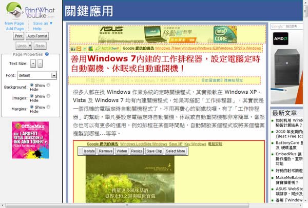 瀏覽網頁時,若看到精彩內容,想要將其列印下來或是轉成 HTML、PDF 等格式,方便分享或保存,通常會碰到網頁內容會夾雜著廣告或是自己認為不需要的部分,因此,當列印時,無形中就會浪費相當多的墨水或碳粉。通常遇到這樣狀況的時候,可以將網頁複製到 Word 或是網頁編輯器,再來重新編輯即可。若不想要這麼麻煩,可以來試試PrintWhatYouLike 這個可在線上選擇網頁內容要保留的部分,並可列印或轉成 HTML 或 PDF 格式的免費服務。