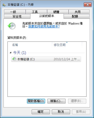 首頁操作技巧Windows 在 Windows 7 內如何還原已從資源回收筒清理掉的檔案或資料夾? 如果在 Windows 7 作業系統裡不小心誤刪了檔案或資料夾,通常我們可以到資源回收筒內將其還原即可,若是連資源回收筒都清理乾淨了,那麼想要拿回該檔案或資料夾,或許我們會透過一些檔案救援軟體,像是 PC INSPECTOR File Recovery 實用的檔案救援工具 或是 Recuva - 檔案救援(把被刪除的檔案救回來) 之類的還原工具。若在安裝這些救援工具之前,可以先來試試 Windows 7 的檔案還原功能,透過 Windows 7 自身內建的功能將不小心刪除的檔案或資料夾,通通還原。 🔔 不錯過任何精彩! 立即訂閱我們的 LINE 官方帳號 每次發佈新文章時,您將會第一時間收到本站文章連結通知,輕鬆掌握最新資訊! 使用 LINE 追蹤文章更新 §相關文章,還可以參閱:你的 Windows 筆電是真睡還是裝睡?一個設定終結背包發熱耗電學起來!微軟親授 10 個提升 Windows PC 效能的技巧如何升級 Windows 11 25H2?最新版本功能亮點與完整更新步驟Windows 工作列時鐘顯示秒數:真的會影響電池續航力嗎?LTT Labs 完整實測解析Windows 快速取出資料夾檔案名稱清單!內建功能輕鬆搞定,不用額外軟體 在 Windows 7 內如何還原已從資源回收筒清理掉的檔案或資料夾? 1.在 Windows 7 內要還原誤刪的檔案或資料夾,相當簡單,只要幾個步驟就可以搞定,首先,開啟原檔案或資料夾所在的磁碟機後,使用滑鼠右鍵點擊後,點擊[內容]。 2.在內容視窗中,切換到[以前的版本]頁籤後,選擇資料夾版本(可依據日期及時間點來選擇),選中要還原的版本,再點擊[開啟舊檔]。 3.開啟舊版的備份後,就可以開始尋找原先檔案或資料夾的存放路徑,可特別注意的是在視窗的上方或顯示目前所呈現的時間點。 4.接下來只要將誤刪的資料夾或檔案,[複製 > 貼上]便可還原。