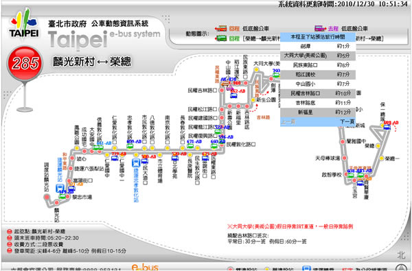 首頁線上工具生活資訊 台北市公車動態資訊系統 - 旅遊景點、查路線、等公車先來看看這裡 想要在台北市活動,估計有很多人會選擇騎摩托車或是搭大眾運輸系統,尤其現在花博正熱,接駁車時間、路線,若是看完花博想往其它地方活動、該如何去...等等,若有以上這些困擾,可以到台北市公共運輸處 - 公車動態資訊系統進行查詢,除了有詳盡的公車路線圖、還將現在在該路線的每班公車目前位置、到達下站位置的預估時間即時標出,相當詳盡。若加上,有可上網的行動裝置,相信等公車應該會成為絕響。 🔔 不錯過任何精彩! 立即訂閱我們的 LINE 官方帳號 每次發佈新文章時,您將會第一時間收到本站文章連結通知,輕鬆掌握最新資訊! 使用 LINE 追蹤文章更新 §相關文章,還可以參閱:459 萬人搶 60 萬份!運動幣中獎號碼公布,快查你的身分證尾數都馬一起GO!LINE GO新年優惠最高拿$800優惠券,還有一個月乘車金等你抽過年搭高鐵自由座要排多久?看LINE就知道 台灣高鐵×LINE TODAY推出春節限定燈號預估服務2026春節看診不煩惱!健保快易通一鍵查詢過年門診資訊2月 Disney+ 不容錯過!韓劇《在你燦爛的季節》、Pixar 原創動畫、漫威英雄一次滿足 如何使用台北市公車動態資訊系統? 1.進入「台北市公共運輸處 - 公車動態資訊系統」後,建議可先看其「如何使用e-Bus」,接下來可以選擇要查詢的標的,例如想要到台北市旅遊,可先點擊左邊分割欄裡的觀光導覽,出現台北市行政區後,點擊想要去的位置,例如[士林夜市]。 2.接下來就會出現有經過士林夜市的所有公車,點擊任意公車編號,例如點擊[285]線。 3.接下來便會列出,該班車路線的行駛路線圖及目前在該路線行駛的班車目前位置,滑鼠右鍵點擊後會列出該班車每站的進站預估時間...等資訊。 有了這個公車即時動態資訊系統,不管是上下班、旅遊相信是一個相當方便的資訊。 台北市公車動態資訊系統網站網址:http://www.e-bus.taipei.gov.tw/