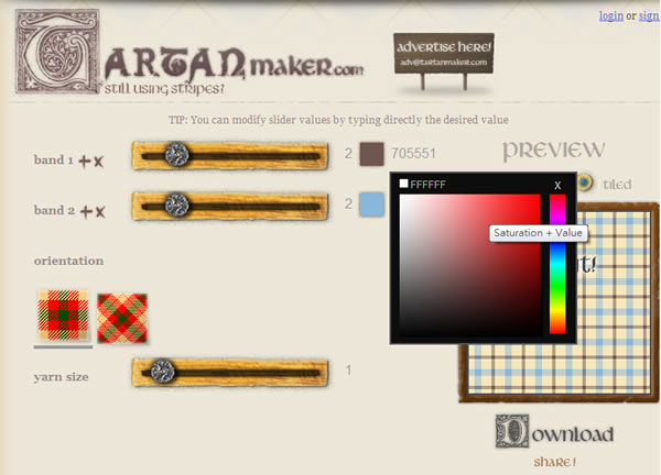 首頁免費素材圖像圖示 Tartan Maker 線上免費的網頁背景圖片製作服務 Tartan Maker 是一個可用來製作網頁背景圖片的免費線上服務,透過 Tartan Maker 網站所提供的格子原圖片素材,後續可自訂其線條與格子顏色、格子數及格子大小、線條粗細等等,方便且快速的用來設計自己喜歡的背景樣式,設計好的樣式圖片提供全螢幕即時預覽與下載,相當方便。 🔔 不錯過任何精彩! 立即訂閱我們的 LINE 官方帳號 每次發佈新文章時,您將會第一時間收到本站文章連結通知,輕鬆掌握最新資訊! 使用 LINE 追蹤文章更新 §相關文章,還可以參閱:精心打造的等距美學:Isocons 免費圖示資源庫,CC BY 4.0 授權Map-It:日本地圖素材的免費寶庫,從全國到市町村一網打盡PICaboo! 日系可愛免費向量圖素材庫:設計師必收的創作寶庫GAHAG:日本免費圖庫新選擇,結合アハ體驗互動遊戲的創意素材平台illust STAMPO:日式風格的免費插圖素材網站 如何使用 Tartan Maker? 1.進入 Tartan Maker 網站後,預設會使用 orientation 內屬於直線型的方格,可點擊另一原型圖片改為斜線素材。 2.在 band 1 旁有 + 及 x 的符號,可用來增加或減少格線數,最少要求為 2 個 band,每個 band 均可使用滑鼠拖動該橫桿的圓形按鈕,及其後均有顏色可供選擇。拖動 yarn size 可改變格子大小。 3.每變更一次,均可點擊[Make it!]來進行預覽,若需要全網頁預覽,可點擊其上方的[Go FullScreen]。 4.設計好之後,可點擊[Download]下載一個 12 x 12 尺寸的 PNG 圖檔格式回自己的電腦。 Tartan Maker網站網址:http://www.tartanmaker.com/