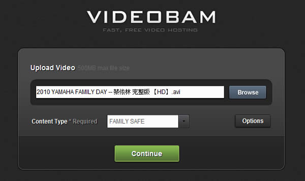 首頁線上工具雲端儲存 VideoBam 免費、免註冊、無容量限制並提供內嵌至網頁語法的影音分享網站 想要將影片分享到網路上與人共享,多數人會想到 YouTube、無名影音或是 Yam 天空影音,而 VideoBam 也是一個非常好用的影音上傳分享服務,使用者最大可以上傳單檔 500MB 以內的影片,沒有總容量或影片長度限制,系統會自動擷取影片數個段落並產生縮圖,供使用者預覽。VideoBam 支援 AVI、MP4、M4V、MOV、WMV、MPG 與 MPEG 等影片格式,並提供線上觀賞、內嵌至網頁的 embed code,具下載影片的功能,且上傳的影片至少保存 60 天,若 60 天內無任何人觀看才會被系統移除。 🔔 不錯過任何精彩! 立即訂閱我們的 LINE 官方帳號 每次發佈新文章時,您將會第一時間收到本站文章連結通知,輕鬆掌握最新資訊! 使用 LINE 追蹤文章更新 §相關文章,還可以參閱:「免費圖片空間」Freeimage.host 讓您輕鬆上傳圖片並獲得分享連結LinkPicture 免費圖床上傳產生 URL 外連網址 圖片可直接檢視或內嵌到網頁imghut 免費圖片分享空間 可直接嵌入網頁使用Archive Forever 輸入網址就可以將網頁或網頁截圖永久儲存在區塊鏈上ZoomHub 線上免費圖片分享空間 可內嵌到其它網頁 如何使用 VideoBam 影音分享網站? 1.進入 VideoBam 影音分享網站後,可註冊一個免費帳號或使用 Facebook 帳號來登入,有註冊的帳戶,當然功能也較多,可追蹤並管理自己所上傳的影片、無限制的上傳及下載、下載 Quicktime 影片,也能夠設定是否顯示分享語法及下載連結。若不想註冊也可以上傳影片,直接點擊[Browse]來選擇要上傳的影片並在 Content Type 選擇影片的類型,若需要設定影片的標題、介紹、標籤、網址等等,可以點擊[Options]來填入也可以在上傳完影片後再修改,確定後,點擊[Continue]。 2.接下來就會開始上傳影片,並顯示目前上傳進度。 3.上傳完成後會產生影片預覽圖及相關連結,包含可使用在 EMail 或 IM 的語法、內嵌至網頁的 embed code、HTML 及 BB Code 的影片預覽圖連結語法,以及加入播放按鈕等等。 VideoBam網站網址:http://videobam.com/