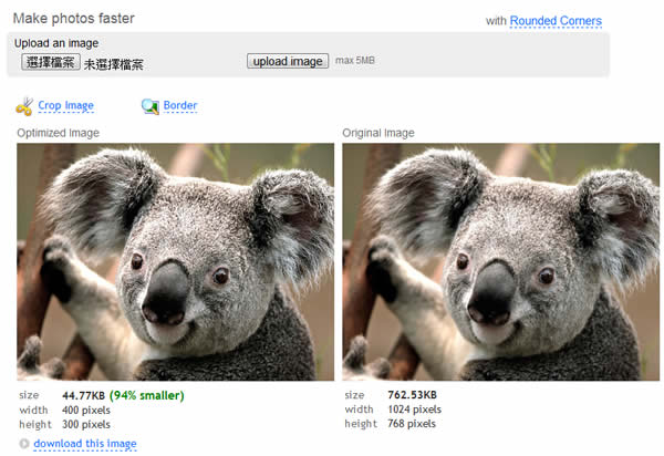 首頁線上工具影像繪圖 WebResizer 簡單方便的線上圖片裁剪、重設尺寸、圓角及最佳化免費服務 想要對圖片進行簡單的處理,例如重新設定圖片的長,寬、圓角畫圖片、裁剪或進行圖片最佳化等等,可以試試WebResizer 這個免費的線上服務,單張圖片限定 5 MB。 🔔 不錯過任何精彩! 立即訂閱我們的 LINE 官方帳號 每次發佈新文章時,您將會第一時間收到本站文章連結通知,輕鬆掌握最新資訊! 使用 LINE 追蹤文章更新 §相關文章,還可以參閱:跟著做就會!教你用 ChatGPT 製作具職業形象的漫畫風頭像Put!所見即所得的 AI 提示詞圖庫:讓你看著範例圖,複製就能做出同級作品Google 親自示範:Nano Banana AI 圖像編輯工具的 13 個熱門玩法照片角度不滿意?AI 幫你調整!3D Camera Control 讓舊照片任意變換視角Meta AI 免費帳戶也能用 Midjourney!無限生成 AI 圖片,台灣可用 如何使用 WebResizer? 1.進入 WebResizer 網站後,點擊[選擇檔案]來選擇要上傳的圖片,選擇好之後,點擊[Upload image]開始上傳,上傳完成後,便可在原本的頁面中看到剛剛所上傳的圖片,左圖是已經經過最佳化且縮減過尺寸而右圖則是原圖,若無太大的需求,則可點擊[download this image]來下載回自己的電腦裡。 2.若想做更進階的處裡,可在同頁面的下方處來進行參數的調整,調整好之後,可點擊[apply changes]則會將圖片顯示成所設定的參數,若要下載則可點擊[download this image]來下載回自己的電腦裡。 3.若想比較圖片品質設定值的差異時,可勾選[Compare image sizes]後,點擊[Start over]則會列出圖片在壓縮品質設定值不同時的差異。 WebResizer網站網址:http://webresizer.com/
