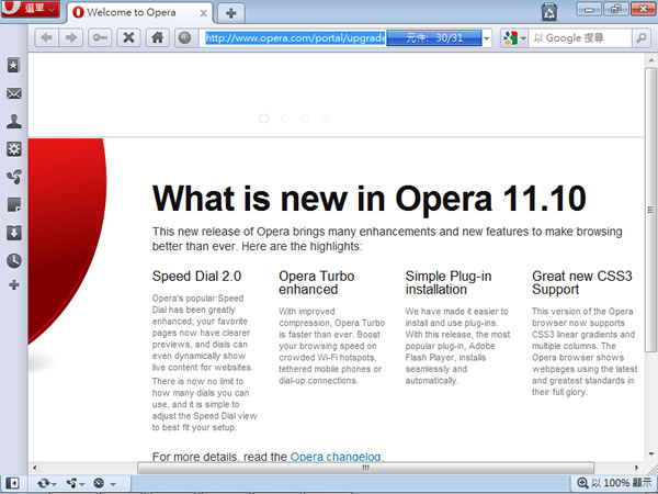 繼微軟推出 IE 9.0 、Firefox 4.0 之後,Opera 也推出 Opera v11.10 網路瀏覽器,各家有各家的特色,從以前在就在 Opera 網站上宣稱的「The fastest browser on Earth」,到現在的「Lightning fast - 快如閃電」,Opera v11.10 有幾個特色,最快的 JavaScript 引擎、支援最新的 HTML5、平滑且快速的繪製圖形、內置下載管理器,支援 BT 下載、從網址列搜索網路、查找頁面中的內容並以高亮顯示、建立屬於自己的快速鍵...等等,絕對是值得一用的免費瀏覽器。另外對於如何使用 Opera 瀏覽器收發 EMail,請參閱 如何使用免費的 Opera 網路瀏覽器,當成 Outlook 來收發電子郵件 。