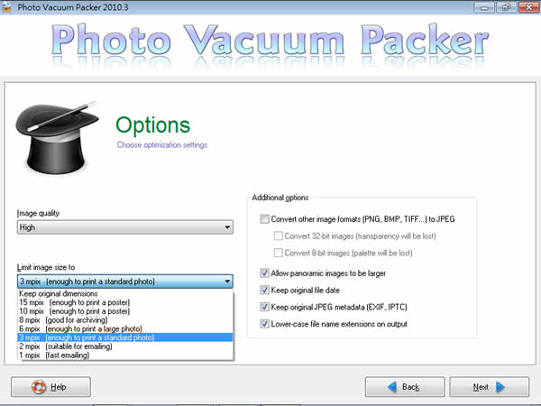 3.接下來進行調整值設定,在 Image quality 可用來調整影像的品質,有 High 及 Standard 模式可供選擇,在 limit image size to 處,可選擇要縮小的尺寸,尺寸以百萬像素為計算單位,若不想索小圖片,也可選擇[Keep original dimensions],只做壓縮圖片。而在右邊的選項部份,可以勾選是否要將 PNG、BMP、TIFF...等等非 JPEG 格式的圖檔,轉為 JPEG,及是否保留原始檔案的日期、相片資訊 EXIF、IPTC…等設定,設定好之後,點擊[Next]。