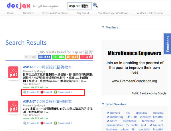 首頁線上工具生產力工具 docjax.com 專找 DOC、XLS、PPT 及 PDF 文件檔的搜尋引擎 docjax.com 是一個專門針對文件檔案進行搜尋的免費服務,只要輸入欲搜尋相關文件的關鍵字,便能列出 DOC、XLS、PPT 及 PDF 這四種格式文件的相關搜尋結果,且在每筆搜尋結果的項目當中,都具有 Preview it (預覽)、Love it (評等) 和 Download it (下載) 的功能,相當的方便。 🔔 不錯過任何精彩! 立即訂閱我們的 LINE 官方帳號 每次發佈新文章時,您將會第一時間收到本站文章連結通知,輕鬆掌握最新資訊! 使用 LINE 追蹤文章更新 §相關文章,還可以參閱:OpenAI 在 ChatGPT 中測試廣告|哪些帳戶受影響、廣告運作原則一次看在蝦皮當賣家,商品如何定價?手續費、免運、稅金怎麼算?蝦皮手續費計算機幫你全搞定!Google AI Plus 降到 260 元對決 ChatGPT Go!誰的功能更值得訂閱?ChatGPT Go 月付 290 元值得嗎?免費版、Plus 完整比較用 AI 做出的電影,YouTube 就看得到!一起來欣賞這部贏得百萬美元的突尼西亞短片《Lily》 如何使用 docjax.com 搜尋引擎? 1.進入 docjax.com 搜尋引擎,在其輸入框中輸入要搜尋的關鍵字(可以使用中文關鍵字)後,點擊輸入框旁的放大鏡,即可進行搜尋。 2.接下來就會列出關鍵字的搜尋結果,在每筆結果中,均具有 Preview it (預覽)、Love it (評等) 和 Download it (下載) 的功能。 3.若要下載可直接點擊[Download it]下載回自己的電腦裡,若想要先預覽其內容,可點擊[Preview it]。 docjax.com網站網址:http://www.docjax.com/
