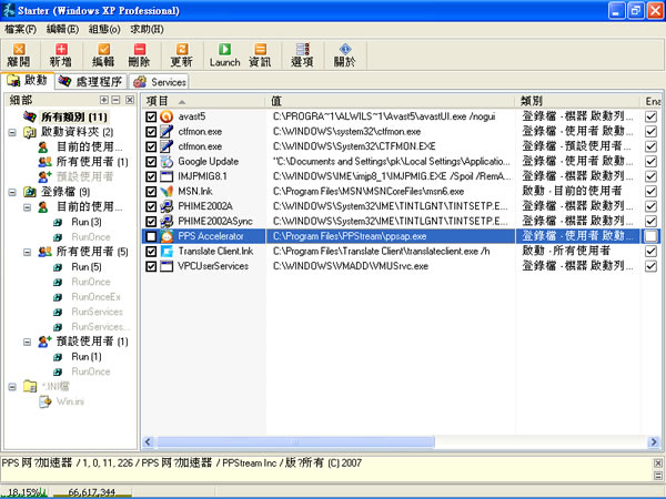 Starter 是一款免費且免安裝的開機流程管理工具,使用者只要將下載的檔案直接解壓縮就能夠使用它,在程式的操作介面中,使用者能夠得知在開機過程中,究竟有哪些程式會被執行,進而從這些被執行的程式中,去除你完全不需要的程式,如此一來,開機時所要執行的程式減少,你的電腦開機速度當然就提升囉。