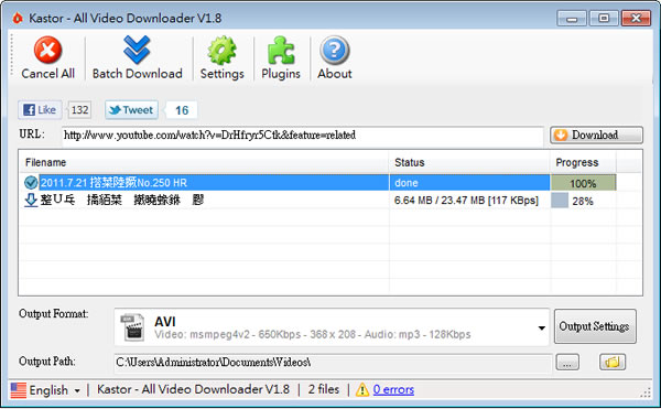 首頁電腦軟體上傳下載 All Video Downloader 支援超過 280 個影音網站的影片下載免費軟體,還可以轉檔 All Video Downloader 是一套用於影音網站內影片下載的免費工具,支援超過 280 個影音網站,像是最常見的 Youtube、Vimeo、Google Video...等均可,下載的影片可直接轉檔成 AVI、WMV、MP4、DVD、MP3、iPhone、PSP、iPod…等常見的影音格式且支援批次下載功能,最多可同時下載 20 個影音檔。 🔔 不錯過任何精彩! 立即訂閱我們的 LINE 官方帳號 每次發佈新文章時,您將會第一時間收到本站文章連結通知,輕鬆掌握最新資訊! 使用 LINE 追蹤文章更新 §相關文章,還可以參閱:ArrowDL 全平台下載利器:輕鬆批量下載 YouTube、BT、FB與多站串流影片YouTubePlaylistDownloader 支援播放清單與頻道的 YouTube 影片下載工具,還能轉換格式Parabolic 讓 yt-dlp 更好用的免費影音下載工具,支援上千個網站的影音下載Hasleo Windows ISO Downloader 幫你從微軟網站下載原版 Windows ISO 檔XMusicDownloader 從音樂網站搜尋並下載歌曲的免費應用程式 如何使用 All Video Downloader? 1.下載並安裝好 All Video Downloader ,開啟主程式後,先在 Output Format 處選擇下載後要轉換的格式,在[Output Path]處為影片下載後預設的儲存路徑,可點擊路徑旁的按鈕加以更改。 2.將影片的網址貼上後,點擊[Download]即可開始下載,下載項目的右側方會顯示目前下載的進度及速度。 3.若想設定影片轉檔的品質,像是影片編碼器、影像顯示尺寸、畫面比例、每秒張數、位元率...等等,可點擊[Output Settings]來進行設定。 4.若要批次下載,可點擊[Batch Download],然後貼上多個影片的網址後,點擊[Download],即可將這些影片加入下載列表中。 4.All Video Downloader 預設一次下載 2個檔案,若要改變同時下載數,可點擊[Settings]進行設定。 All Video Downloader版本:1.8語言:英文性質:免費適用:Windows官方網站:http://www.allvideodownloader.com/下載:按我下載
