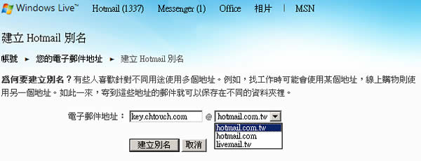 通常我們在使用 GMail、Yahoo 或 Hotmail 這些免費的電子郵件信箱,都只能使用註冊當時的帳號,當碰到一些需要使用電子郵件註冊的服務,像是免費的軟體、網路購物、線上遊戲...等等的註冊,若只想臨時的應用,通常也會使用像是 10 Minute Mail 免費的拋棄式電子郵件信箱,免去垃圾郵件的困擾! 這種臨時性的電子郵件信箱或是重新去申請一個,有時也會覺得不方便。現在微軟 Hotmail 可以讓我們替原有已申請的 Hotmail 來建立別名,為什麼要替 Hotmail 建立別名,建立後有什麼用處?微軟在其建立別名的頁面上已有說明:有些人喜歡針對不同用途使用多個地址。例如,找工作時可能會使用某個地址,線上購物則使用另一個地址。如此一來,寄到這些地址的郵件就可以保存在不同的資料夾裡。微軟允許替一個帳號建立 5 個別名,郵件的後綴網域名稱則可則依當初申請的郵件條件,會出現不同的網域 hotmail.com、hotmail.com.tw、live.com 及 livemail.tw 或 livemail.cn ...等,在不使用時,也可以將它移除,如此一來,當碰到有需要註冊、公布自己的電子郵箱時,就可以使用已建立好的別名進行分類或用來保護自己真實電子郵箱的地址。