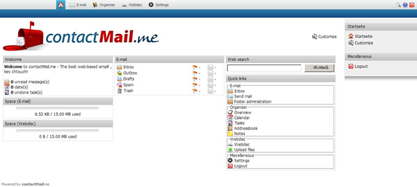 首頁線上工具郵件簡訊 contactMail.me 免費的電子郵件信箱服務(含網路硬碟) 有提供免費電子郵件信箱服務的網站,大家可能都比較知道 Google GMail、 Microsoft Hotmail、Yahoo eMail 及 智邦生活館免費信箱功能等等。而 contactMail.me 則是一個剛推出且以 Web 為基礎的免費電子郵件信箱服務,容量為 15 MB 再加上免費網路硬碟空間也是 15 MB,共 30 MB 空間可供應用,雖說提供的空間容量比不上那些知名的免費服務,但它的功能可沒有減少,且現在註冊,還可以取得較好記的名稱。 🔔 不錯過任何精彩! 立即訂閱我們的 LINE 官方帳號 每次發佈新文章時,您將會第一時間收到本站文章連結通知,輕鬆掌握最新資訊! 使用 LINE 追蹤文章更新 §相關文章,還可以參閱:MinMail Temp Mail 免費的臨時電子郵件信箱服務,24小時內有效TempMail100:快速取得可接收電子郵件的臨時信箱,輕鬆防止垃圾郵件臨時電子郵箱 Email.ML:有效期一小時,無廣告支援中文郵件22.Do:可用 gmail.com 當後綴地址的免費臨時電子郵件信箱,24小時有效期AdGuard Temp Mail:保護隱私、區分用途的免費臨時電子郵件服務 如何使用 contactMail.me? 1.進入 contactMail.me 網站後,可點擊[Sign up!]來進行註冊。 2.輸入所需要填寫的資料後,點擊[Sign Up]。 3.註冊成功後,會出現訊息提示,點擊其下的[Login]來登入。 4.登入後,你會發覺功能樣樣不少。 contactMail.me網站網址:http://www.contactmail.me/