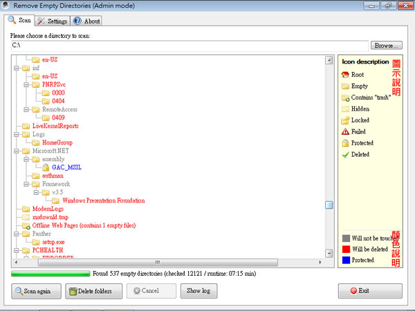 3.掃描完成後,可參考視窗右列的圖示及顏色說明,若要刪除這些資料夾,可點擊[Delete folders]來刪除,