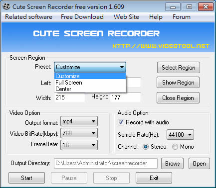 1.下載後進行安裝,安裝完成後開啟主程式,可在視窗的「Preset」處來選擇要錄影的範圍,預設是使用 Cutomize可以自訂錄製螢幕區域、Full Screen 則是錄製全螢幕,Center 則是錄製畫面正中央的區域,若都沒有適合的,可以點擊[Select Region],點擊後,滑鼠的游標會變成+字形,讓你可以畫出要錄製的區塊,畫好之後,點擊[Show Region]便會使用綠色線條標示出螢幕的錄製範圍,點擊[Close Region]則會隱藏錄製區塊的綠色線條。