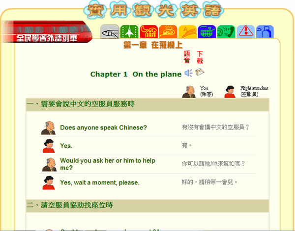 首頁教育學習英文 「實用觀光英語」內容從在飛機上、辦理入境手續、飯店住宿登記、用餐...共 9 篇,含語音導讀,可單篇或全部下載 2015-9-18 修正官網連結網址 「全民學習外語列車 - 實用觀光英語」是一個提供基礎的觀光英語會話內容,內容依使用情境區分為「在飛機上」、「辦理入境手續」、「飯店住宿登記」、「用餐」、「觀光」、「購物」、「打國際電話」、「緊急狀況」、「辦理登機手續」。內容淺顯易懂,若怕自己說的不標準、每篇的情境對話均有語音可供練習且可單篇或全部下載回自己的電腦,解壓縮後會有中、英文對話、單字教材 Word 檔及 8 個 MP3 檔案,可轉檔後燒錄成 CD 片,讓你隨時可以練習。 🔔 不錯過任何精彩! 立即訂閱我們的 LINE 官方帳號 每次發佈新文章時,您將會第一時間收到本站文章連結通知,輕鬆掌握最新資訊! 使用 LINE 追蹤文章更新 §相關文章,還可以參閱:Reading Coach: 微軟線上英文學習 AI 工具,幫助提升英文發音準確性Google 「詞彙測驗」,隨時測驗自己對英文單字的識別能力善用「國家圖書館-空中英語教室影音典藏學習系統」免費線上學英語「英文字母」與「數字」筆順練習簿免費下載MvQdict 免費英漢、漢英、英英字典,助你英文更上一層樓 如何使用「全民學習外語列車 - 實用觀光英語」? 1.進入 「全民學習外語列車 - 實用觀光英語」網站後,可以看到內容目錄,若想將教材全部下載時,可以點擊[全部內容下載],解壓縮後會有中、英文對話、單字教材 Word 檔及 8 個 MP3 檔案。 2.若想在線上學習,可以點擊感興趣的內容,例如點擊[第一篇]後,便會進入內容,每篇的內容均可單獨下載,若需要語音協助時,可以點擊喇叭圖示,便有語音。 3.在課程的最後部分均附有該課程內容會用到的實用字彙。 4.下載解壓縮後的 Word 教材。 全民學習外語列車 - 實用觀光英語語言:繁體中文性質:免費官方網站:http://wise.edu.tw/resource/course/english/index.htm下載:檔案下載
