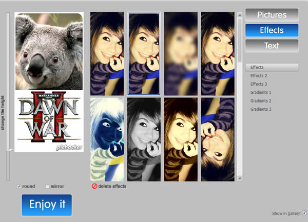 5.加入特效,若對加入的文字、特效或合成的相片不滿意時,可以點擊其下的[Delete],若想使用圓角圖片時,可以勾選[Round],若覺得有空白可以勾選[Mirror]來替通白加入元圖片的倒影,滿意後,點擊[Enjoy it]。