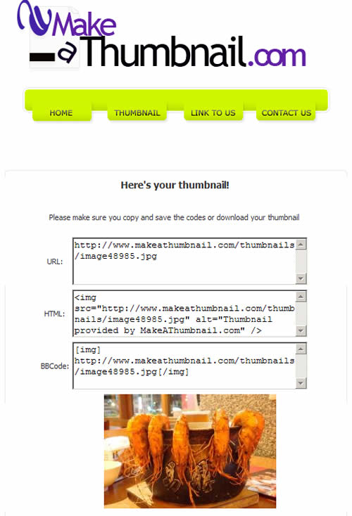 首頁線上工具生產力工具 Make a Thumbnail 可產生上傳圖片的縮圖,並提供縮圖的網址連結 想要將圖片產生縮圖並將縮圖後的圖片貼到網頁裡,可以試試這個免費的 Make a Thumbnail 網站服務,使用的方式相當簡單,只要將圖片上傳到 Make a Thumbnail 網站並指定要縮圖的尺寸,便能產生縮圖的圖片、圖片縮圖後的連結網址、HTML Code 及用於論壇的 BBCode ,算是相當方便的服務。 🔔 不錯過任何精彩! 立即訂閱我們的 LINE 官方帳號 每次發佈新文章時,您將會第一時間收到本站文章連結通知,輕鬆掌握最新資訊! 使用 LINE 追蹤文章更新 §相關文章,還可以參閱:OpenAI 在 ChatGPT 中測試廣告|哪些帳戶受影響、廣告運作原則一次看在蝦皮當賣家,商品如何定價?手續費、免運、稅金怎麼算?蝦皮手續費計算機幫你全搞定!Google AI Plus 降到 260 元對決 ChatGPT Go!誰的功能更值得訂閱?ChatGPT Go 月付 290 元值得嗎?免費版、Plus 完整比較用 AI 做出的電影,YouTube 就看得到!一起來欣賞這部贏得百萬美元的突尼西亞短片《Lily》 如何使用 Make a Thumbnail? 1.進入 Make a Thumbnail 網站後,點擊[瀏覽]來選擇要上傳的圖片,選擇好之後,再來選擇要縮圖的尺寸,確定好之後,點擊[Make A Thumbnail]。 2.接下來就會產生該圖片的縮圖及縮圖的直接連結網址、HTML Code 及用於論壇的 BBCode。 3.範例,使用 URL 將縮圖貼到網頁裡。 Make a Thumbnail網站網址:http://www.makeathumbnail.com/