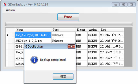 4.接下來,點擊[Exec] 便會根據你所設定的帳號及密碼來登入 Google Doc ,並將存放在裡面的檔案列出、備份到剛剛所設定的資料夾內。