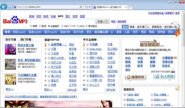 「百度」是中國大陸常用的搜尋引擎,除了提供搜尋的功能之外,旗下的「百度 MP3」服務,也是深受大家喜愛的服務之一,在「百度 MP3」裡,可以輸入關鍵字查詢,也可以透過其詳盡的分類從歌手、新歌 Top 100、Top 500、經典老歌、熱門對唱、日韓流行歌曲、歐美歌手、兒歌...輕而易舉地就找到自己喜愛的歌曲,而找到的歌曲,可以在線上收聽亦可下載回自己的電腦裡,若是使用其搜尋的功能,直接輸入繁體中文就可以,很方便。