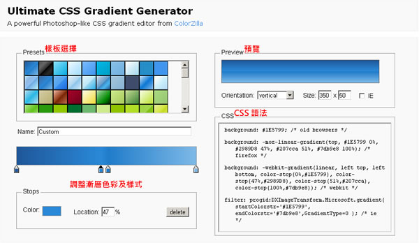 首頁線上工具開發工具 Ultimate CSS Gradient Generator 網頁背景色彩 CSS 語法線上產生器 製作網頁時,通常會使用到長、寬不等的背景圖,尤其是網頁中每個單元標題內的背景色彩,要產生這種背景時,通常有兩種做法,一是可以使用背景圖片;再來則是使用 CSS 語法,兩種方法各有優缺點。Ultimate CSS Gradient Generator 網站則是以 CSS 語法為主,使用方式相當簡單,可自訂色彩代碼,混入漸層、自訂長、寬後,只要複製其產生的 CSS 語法,便能應用到網頁裡。 🔔 不錯過任何精彩! 立即訂閱我們的 LINE 官方帳號 每次發佈新文章時,您將會第一時間收到本站文章連結通知,輕鬆掌握最新資訊! 使用 LINE 追蹤文章更新 §相關文章,還可以參閱:網站效能健檢免費工具!PageTest 多裝置模擬效能分析及由 AI 提出改進建議Regex-Vis 圖解正則表達式的線上工具,可編寫還可驗證Sitemap Generator:線上快速產生符合 SEO 標準的網站地圖,無網址數量限制適用各類型網站網站隱私權政策產生器 Privacy Policy Generator:輸入網站名稱和網址即可輕鬆生成專屬條款Frame0:輕鬆繪製應用程式流程圖、UML 和介面雛形的免費工具,適用於 macOS 與 Windows 如何使用 Ultimate CSS Gradient Generator? 1.進入 Ultimate CSS Gradient Generator 網站後,在 Presets 處選擇要使用的顏色樣板。 2.另外可以調整漸層的色彩,只要使用滑鼠拖動色彩調整桿(下圖 紅色框),其 Stop 處的 color 點擊顏色便可調整。 3.調整好之後,在 Preview 處,可調整長寬、垂直或水平及一個 IE 選項,若勾選 IE 選項時,則原有的漸層會消失,原因為 IE 並不支援漸層的 CSS 語法,確定後,只要複製 CSS 框中的語法後,貼到網頁裡,便可應用。 Ultimate CSS Gradient Generator網站網址:http://www.colorzilla.com/gradient-editor/