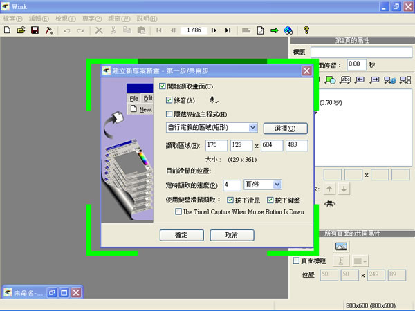 2.如果我們要將電腦螢幕的畫面錄影下來,點擊[檔案] > [開新專案],接下來是專案的一些屬性設定,可以勾選擷取畫面時是否包含聲音、錄製畫面時Wink主程式是否隱藏最小化、選擇錄製範圍,如整個螢幕、800X
