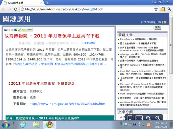 首頁操作技巧Google 如何透過 Google Chrome 瀏覽器直接開啟 PDF 檔案? 想要開啟 PDF 檔案,一般來說就是安裝像是 Adobe Reader、Foxit Reader 免費輕巧的PDF閱讀器(繁體中文版)等 PDF 閱讀器,若不想安裝還可以上傳到 Google Doc 服務,來進行開啟,不過這些方式都還有些麻煩,若電腦裡已經有安裝 Google Chrome 瀏覽器時,現在就可以透過 Google Chrome 瀏覽器直接開啟 PDF 檔案,免外掛,開啟速度超快。 🔔 不錯過任何精彩! 立即訂閱我們的 LINE 官方帳號 每次發佈新文章時,您將會第一時間收到本站文章連結通知,輕鬆掌握最新資訊! 使用 LINE 追蹤文章更新 §相關文章,還可以參閱:照著做就會!Google 官方釋出 NotebookLM 簡報製作的 8 種範例教學機車族專屬!Google Maps 推出 5 款超萌機車圖示 × 8 種顏色,設定步驟看這篇Google Skills:3000+ 門課程助你打造 AI 時代競爭力Google Vids 全解析:一文看懂功能、免費版限制及完整操作步驟實際範例教你在 Gemini 用 Canvas 模式,開發 Nano Banana 圖像處理 Web App 如何使用 Google Chrome 瀏覽器直接開啟 PDF 檔案? 1.要使用 Google Chrome 瀏覽器直接開啟 PDF 檔案,必須為 Google Chrome 9.0 以後版本,要開啟時,只要將 PDF 檔案,使用滑鼠拖拉放到 Google Chrome 瀏覽器內,便可開啟。 2.若不能開啟時,又不是版本太舊,可能原因為該外掛程式被關閉,可在網址列輸入[about:plugins]後,重新啟用 Chrome PDF Viewer。 3.若是想將 Google Chrome 當作 PDF 檔案的預設開啟程式時,以 Windows 7 為例,可對任一個 PDF 檔案使用滑鼠右鍵點擊後,再選擇[開啟檔案] > [選擇預設程式],然後按下確定來打開[開啟檔案]視窗,選擇 Google Chrome ,並將[永遠用選取的程式來開啟這種檔案]勾選後,點擊[確定],那麼以後開啟 PDF 檔案時,便會使用 Google Chrome 瀏覽器來開啟。