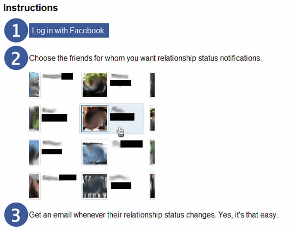 首頁線上工具生活資訊 Facebook Breakup Notifier 感情狀態變更通知服務 對於自己在 Facebook 上的好友,若有暗戀或是喜歡的對象時,可以參考其在 Facebook 上所公布的感情狀態,但若是要你每天一個個去關注對象的感情狀態時,恐怕也不是太正確的作法,這時候可參考 Facebook Breakup Notifier 感情狀態變更通知服務,透過這個線上服務,只要關注的對象感情狀態一有變化,就會發出 E-Mail 來通知你。 🔔 不錯過任何精彩! 立即訂閱我們的 LINE 官方帳號 每次發佈新文章時,您將會第一時間收到本站文章連結通知,輕鬆掌握最新資訊! 使用 LINE 追蹤文章更新 §相關文章,還可以參閱:LINE GO 首頁大改版!3 大功能升級讓叫車租車更順暢怎麼吃才健康?美國官方膳食指南:優先蛋白質、全脂乳製品,強調吃真食物AI 醫療新時代:OpenAI 推出 ChatGPT Health,你的專屬健康管理專家租屋族必看!2026 租金補貼完整攻略:申請資格、各縣市金額、審核進度懶人包馬年刮刮樂正式開賣!五路財神等5款怎麼選?中獎率、賺錢率、代碼玄機全解析 如何使用 Facebook Breakup Notifier? 1.進入 Facebook Breakup Notifier 網頁後,點擊[Log in with Facebook.]來登入你的 Facebook 帳號,並允許 Facebook Breakup Notifier 來存取你的帳號資料。 2.接下來就會列出你在 Facebook 上的所有朋友,可用性別來篩選並設定所關注的感情狀態,接下來就去列出朋友裡使用滑鼠點擊所要關注的對象即可。 Facebook Breakup Notifier網站網址:http://www.breakupnotifier.com/