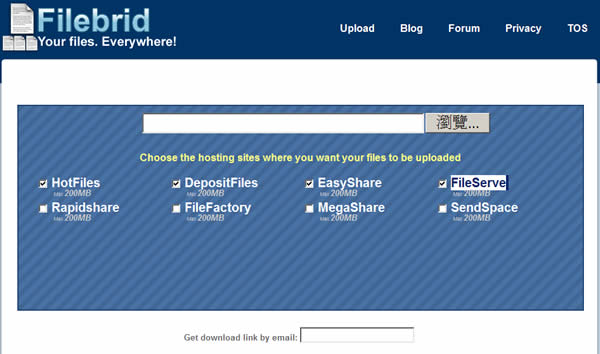 首頁線上工具上傳下載 Filebrid 讓你一次將檔案上傳多個免費空間 免費空間有相當多,不過多數的免費空間都有共同的限制,就是下載前要等待,免費的使用者一天只能下載多少流量...等等不同的限制,若你有使用這些免費空間的需求時,又不想一個個上傳,可以試試這個 Filebrid 的免費服務,Filebrid 可以將檔案一次就上傳到所指定的免費空間服務,這些免費空間服務包括 HotFiles、Rapidshare、DepositFiles、FileFactory、EasyShare、MegaShare、FileServe 及 SendSpace 上傳的檔案一律最大為 200 MB 的限制。 🔔 不錯過任何精彩! 立即訂閱我們的 LINE 官方帳號 每次發佈新文章時,您將會第一時間收到本站文章連結通知,輕鬆掌握最新資訊! 使用 LINE 追蹤文章更新 §相關文章,還可以參閱:M3U8 Player:本地瀏覽器處理,播放、下載、轉 MP4 一站免費完成getM3U8 免費線上工具:輕鬆下載 M3U8 串流影片並轉檔 MP4SnapWC 免費影片下載器:一鍵搞定 YT、IG、FB、抖音等 10,000+ 平台影片、音訊、圖片需要分享圖片連結?試試 PiXhost 免費圖床服務P2PFileShare 線上 P2P 傳檔免費工具,免安裝無檔案大小限制直接瀏覽器傳輸 如何使用 Filebrid 來上傳免費空間? 1.進入 Filebrid 網站後,點擊[瀏覽]來選擇要上傳的檔案,選擇要上傳的免費空間,輸入上傳完成後,由系統發送到你所輸入的電子郵件地址,內容為各個免費空間的檔案連結(可不輸入),確認好之後,點擊[Upload Now!]。 2.上傳完成後,便會轉到檔案的連結頁面。 3.點擊該連結,便會出現剛剛上船的免費空間的列表,要取得每個空間的連結網址,可點擊其後的[Download]來取得。 4.例如點擊 Fileserver 後的[Download],便可取得 Fileserver 的連結網址方便你後續應用到其他網頁裡。 Filebrid網站網址:http://www.filebrid.com/index.html
