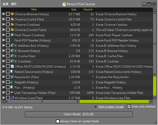首頁電腦軟體系統應用 Moo0 DiskCleaner 清理硬碟中系統的暫存檔案、註冊表資料、瀏覽器的暫存檔案及歷史記錄與 Cookies(免安裝 繁體中文版) Windows 系統用的越久,若無定時清理硬碟中因系統更新時所留下的暫存檔案、註冊表資料或是使用瀏覽器所留下來的暫存檔案、瀏覽歷史記錄及暫存在硬碟中的 Cookies(IE、Firefox、Opera、Chrome)等等,常常會造成硬碟空間被這些無用的檔案所佔據而不自知,有時想清理,卻也不知道那些可以刪除,那些又不可以,若有這些困惱時,可以試試 Moo0 DiskCleaner 這套免費的系統清理工具, 使用 DiskCleaner 時,他會將系統可刪除的檔案,分門別類地歸納好,讓你來勾選要刪除的項目,讓清理系統的工作變得相當簡單。 🔔 不錯過任何精彩! 立即訂閱我們的 LINE 官方帳號 每次發佈新文章時,您將會第一時間收到本站文章連結通知,輕鬆掌握最新資訊! 使用 LINE 追蹤文章更新 §相關文章,還可以參閱:CatLock:可鎖定鍵盤的 Windows 應用程式,防止寵物意外觸碰Zen Ad blocker 瀏覽器與應用程式均適用的廣告攔截器,免費且開放原始碼TimVer 一站式顯示 Windows 版本及電腦硬體相關訊息的工具「微軟電腦管家」內含開機啟動項目管理、儲存空間最佳化等免費工具 全方位提升電腦效能Windows Startup Timer 測量 Windows 從開機到完全啟動所需時間 如何使用 DiskCleaner? 1.下載免安裝版解壓縮後,執行「DiskCleaner.exe」便可開啟,不需安裝,開啟後,便會將系統可清理的檔案及其所佔用硬碟多少空間依照類別列出。 2.若需要知道這些被列為需清理檔案的更詳細資料,可點擊每個項目前的三角形,展開後,會列出子分類,再點擊便會開啟所在的檔案路徑供你檢視。 3.勾選要清理的項目後,點擊[Clean Now!]便可開始清理。 Moo0 DiskCleaner版本:1.23語言:繁體中文(多國語言)性質:免費適用:Windows官方網站:http://www.moo0.com/software/DiskCleaner/下載: 免安裝版 按我下載 安裝版 按我下載