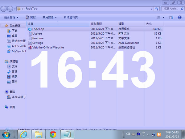首頁電腦軟體生產力工具 FadeTop 視覺化的提醒電腦使用者休息時間(免安裝) 使用電腦工作時,常會忘了該休息的時間?若能使用 FadeTop 這套免費的軟體,便能夠定時的提醒休息時間,FadeTop 可以自訂每隔一段時間,讓電腦螢幕使用淡進淡出的視覺效果來顯示目前系統時間,且封住整個電腦螢幕,並在經過自訂的時間後,開放電腦螢幕可以繼續操作。 🔔 不錯過任何精彩! 立即訂閱我們的 LINE 官方帳號 每次發佈新文章時,您將會第一時間收到本站文章連結通知,輕鬆掌握最新資訊! 使用 LINE 追蹤文章更新 §相關文章,還可以參閱:AingDesk:一鍵安裝 Ollama AI 模型管理器,讓 LLaMA、DeepSeek 在本機電腦上運行Arc 瀏覽器正式登陸 Windows 11,開啟全新瀏覽體驗!Norton Secure Browser 使用 Chromium 核心的瀏覽器,有廣告封鎖和隱私保護功能BingGPT 桌面應用程式,讓你不用 Edge 也能用 Bing 聊天機器人SlippyClerk 數字、英文字母有序字串產生器 可自訂前後綴字詞 如何使用 FadeTop? 1.下載 FadeTop 免安裝版並解壓縮後,執行「FadeTop.exe」便可開啟,無須進行安裝。 2.開啟後,會在右下角會顯示 FadeTop 的圖示,使用滑鼠右鍵點擊便可出現右鍵功能表,點擊[Options...]。 3.在出現的設定視窗中,可以參考下圖來設定,設定好之後,點擊[OK]。 4.當時間到達所自訂的時間後,電腦螢幕就會以淡進淡出的方式封住螢幕。 FadeTop版本:3.1.0.174語言:英文性質:免費適用:Windows官方網站:http://www.fadetop.com/下載: 免安裝版 按我下載 安裝版 按我下載