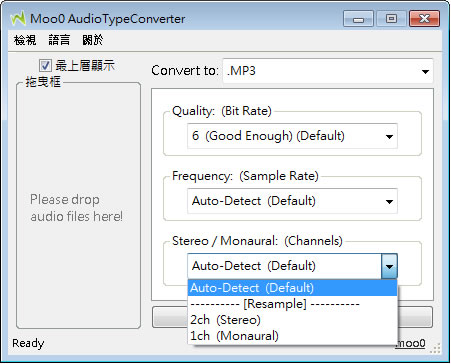 首頁電腦軟體檔案管理 Moo0 AudioTypeConverter 音樂格式轉換工具 Moo0 AudioTypeConverter 是一套免費可用於音樂格式互相轉換的工具,操作相當簡單,只要選擇好要轉出的音樂格式,再將要轉檔的音樂檔案,使用滑鼠拖曳到轉檔區,便開始轉換,Moo0 AudioTypeConverter 目前支援的輸入/輸出 Audio 格式有:3GP、3GP (AAC)、3G2、3G2 (AAC)、AAC、AC3、AIFF、AMR、AU、AU (a-Law)、AU (u-Law)、FLAC、M4A、M4A (ALAC)、MMF、MOV、MP2、MP3、MP4、OGG、OGG (FLAC)、RA、RM、WAV、WAV (ADPCM IMA)、WAV (ADPCM Microsoft)、WAV (ADPCM Yamaha)、WAV (GSM)、WMA、PCM (Little-Endian)、PCM (Big-Endian)、PCM (a-Law)、PCM (u-Law),基本上目前常用的均已支援,是個相當方便音樂格式轉換工具。 🔔 不錯過任何精彩! 立即訂閱我們的 LINE 官方帳號 每次發佈新文章時,您將會第一時間收到本站文章連結通知,輕鬆掌握最新資訊! 使用 LINE 追蹤文章更新 §相關文章,還可以參閱:檔案好多重複怎麼辦?免費 dupeGuru 幫你一鍵清出電腦空間[ 免費使用 ]PDFgear 整合各種 PDF 工具,具格式轉換、編輯、合併或拆分等功能7-Zip 檔案壓縮與解壓縮免費軟體AmoK Exif Sorter 讓照片按拍照日期重新命名並自動分類的免費軟體PDF Unshare 限制 PDF 檔案的讀取有效日期 如何使用 Moo0 AudioTypeConverter? 1.下載、安裝、開啟 Moo0 AudioTypeConverter 後,預設轉出的格式是 MP3 格式,可點擊[Convert to]來選擇要轉出的格式 2.選擇好轉檔的格式後,將要轉檔的聲音檔案,使用滑鼠拖曳到 Moo0 AudioTypeConverter 所指定的位置,便開始按照前一步驟所選的格式進行轉換,轉換時,下方處會有進度條來提示。 3.若需要更進階的設定轉出的品質參數,可點擊[進階選項],切換到進階模式,操作方式基本上均同前。 Moo0 AudioTypeConverter版本:1.32語言:英文性質:免費適用:Windows官方網站:http://www.moo0.com/software/AudioTypeConverter/下載:按我下載