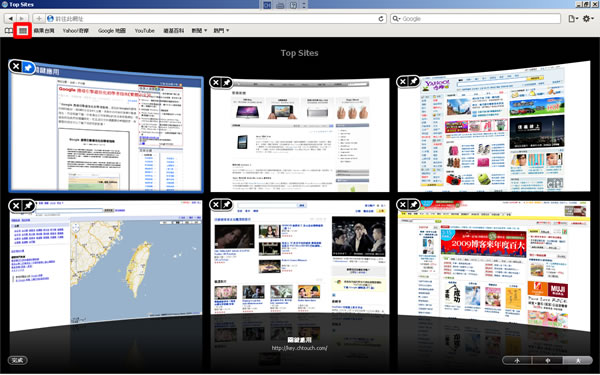 2.安裝完成後,開啟Safari瀏覽器,首先我們來看看「Top Site」這項功能,Top Site也就是會記錄常去的網站,可以讓你一目了然直接點選常去的網站,這個功能幾乎所有瀏覽器都有,只是Safari瀏覽器把它做的非常酷炫及人性化,整個就像是個漂亮的電視牆,而且還可以自行設定格子的尺寸、數量(最多24個、最少6個),另外還可將特別常用的網頁縮圖移動、固定到你指定的位置,或者刪除不常用的網站。點擊左上角紅色框住的按鈕,成Top Site模式,(有些電腦因為顯示卡不支援這種大螢幕的顯示方式,所以也沒有這顆按鈕)