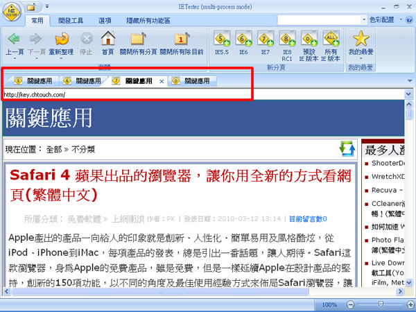 5.接著就會將IE所有版本以分頁的方式呈現,切換不同的分頁來查看目前網頁在IE不同版本的呈現狀況。