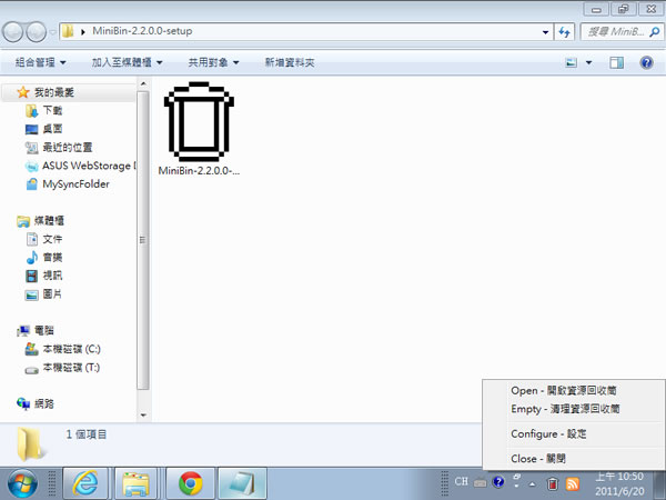 首頁電腦軟體系統應用 MiniBin 在工作列通知區域上增加一個資源回收筒圖示,方便檢視與清理 通常在 Windows 刪除檔案後,需要回到視窗的桌面上來查看資源回收筒的圖示,若有剛剛所刪除的檔案時,便執行「清理資源回收筒」的動作,實在有點不方便,MiniBin 在安裝完成後,可以在系統工作列上的通知區域內顯示一個「資源回收筒」的圖示,方便檢視與清理回收桶內被刪除的檔案。 🔔 不錯過任何精彩! 立即訂閱我們的 LINE 官方帳號 每次發佈新文章時,您將會第一時間收到本站文章連結通知,輕鬆掌握最新資訊! 使用 LINE 追蹤文章更新 §相關文章,還可以參閱:CatLock:可鎖定鍵盤的 Windows 應用程式,防止寵物意外觸碰Zen Ad blocker 瀏覽器與應用程式均適用的廣告攔截器,免費且開放原始碼TimVer 一站式顯示 Windows 版本及電腦硬體相關訊息的工具「微軟電腦管家」內含開機啟動項目管理、儲存空間最佳化等免費工具 全方位提升電腦效能Windows Startup Timer 測量 Windows 從開機到完全啟動所需時間 如何使用MiniBin ? 1.下載、解壓縮並安裝,安裝完成後,開啟 MiniBin 便會在工作列上的通知區域內看到 MiniBin 所見裡的資源回首筒圖示。 2.使用滑鼠右鍵點擊,便能啟用右鍵功能表,若要清空資源回收筒時,點擊[Empty]即可,點擊[Configure]可進行 MiniBin 的參數設定。 3.開啟[Configuration]的設定視窗後,可以設定更新間隔、是否使用滑鼠雙擊圖示來清理垃圾筒、清理完播放音效等設定,在 Language 處可自行定義右鍵選單的名稱,右邊的「Select Theme」是選擇垃圾筒的圖示樣式,不過目前僅有二種可選擇。 4.定義好[Language]後,當使用滑鼠右鍵點擊時,便會以我們定義好的中文來顯示。 MiniBin版本:2.2.0.0語言:英文性質:免費適用:Windows官方網站:http://www.e-sushi.net/下載:按我下載