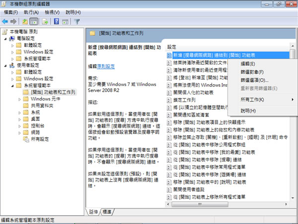 2.開啟「本機群組原則編輯器」設定視窗後,展開[本機電腦 原則] 後,依序點擊 [使用者設定] > [系統管理範本] > [開始]功能表和工作列,展開後,在「新增[搜尋網際網路]連結到[開始]功能表」使用滑鼠右鍵點擊,在所出現的右鍵功能表中,點擊[編輯]。