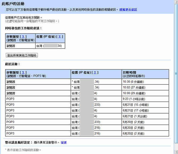 首頁操作技巧Google Gmail 帳戶活動記錄功能,檢視帳戶有無異常登入 Google GMail 已經是很多人必備的電子郵件信箱了,隨著廣大的用戶,常常也成為有心人入侵的對象,想要了解自己GMail 帳戶的活動紀錄,可以透過 GMail 的帳戶活動紀錄來檢視自己郵件的最近活動的相關資訊。每當有人透過一般瀏覽器、POP 用戶端或行動裝置等工具存取郵件時,GMail 就會將相關資訊記錄在最近活動中,GMail 會列出曾存取郵件的 IP 位址、其相關聯的位置以及時間和日期。 🔔 不錯過任何精彩! 立即訂閱我們的 LINE 官方帳號 每次發佈新文章時,您將會第一時間收到本站文章連結通知,輕鬆掌握最新資訊! 使用 LINE 追蹤文章更新 §相關文章,還可以參閱:別再只會用兩指縮放 Google 地圖了!這些隱藏手勢讓你效率翻倍照著做就會!Google 官方釋出 NotebookLM 簡報製作的 8 種範例教學機車族專屬!Google Maps 推出 5 款超萌機車圖示 × 8 種顏色,設定步驟看這篇Google Skills:3000+ 門課程助你打造 AI 時代競爭力Google Vids 全解析:一文看懂功能、免費版限制及完整操作步驟 如何檢視 GMail 的帳戶活動紀錄? 1.登入自己的 GMail 帳戶後,在網頁的最下方處會顯示可用及已使用的容量之外,在其下方還會顯示目前登入的 IP 位置及已登入時間,若要知道自己登入的紀錄,可以點擊[詳細資料]。 2.接下來便會顯示你的電子郵件帳戶最近的活動。