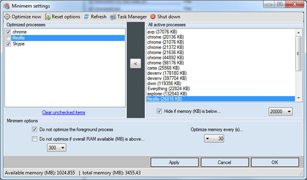 2.接下來出現設定的視窗,視窗裡面有左右兩個區域,在預設的狀態下右邊的區域會顯示目前所有記憶體用量超過 15000 KB 且正在執行的程序,我們可以取消勾選[Hide if memory < 15000 K]或是調降記憶體來顯示更多運作中的程序,將需要進行最佳化程序點選到左邊方塊,Minimem便會自動管理並且每隔30秒進行一次最佳化,當然你可以更改,上方按鈕由左至右分別為: