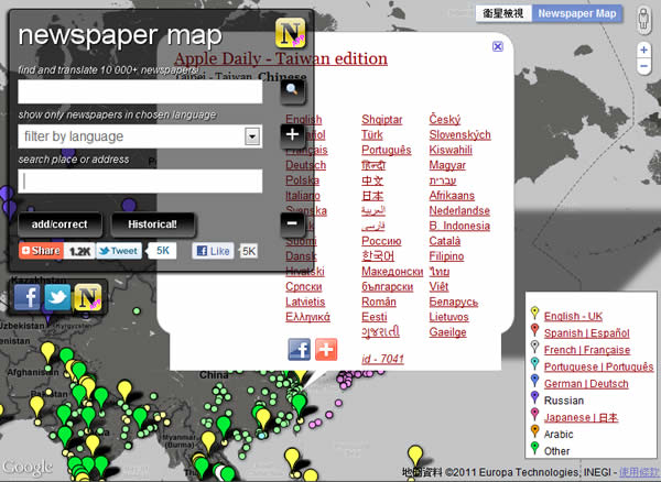 首頁線上工具電子書與閱讀 Newspaper Map 全球超過 10000 份的報紙免費閱讀 傳統報紙在什麼都要數位化的時代中,做了很大的轉變,因應讀者閱讀習慣的改變,多數的報紙業也開始提供線上閱讀的服務,若想知道各地報紙的頭條新聞或是想到當地做深度旅遊時,若想閱讀下當地最近所發生的事情時,可以到Newspaper Map 這個免費的服務網站,Newspaper Map 是個蒐集了全世界各地超過 10000 個的線上報紙並結合 Google 地圖及 Google 翻譯的功能的讓你快速找到想要閱讀的報紙。 🔔 不錯過任何精彩! 立即訂閱我們的 LINE 官方帳號 每次發佈新文章時,您將會第一時間收到本站文章連結通知,輕鬆掌握最新資訊! 使用 LINE 追蹤文章更新 §相關文章,還可以參閱:SaltyLeo 的書架:愛書人必收藏!百萬電子書免費搜尋與下載金庸網:讓你免費閱讀所有金庸小說全集及人物介紹破萬卷小說網:線上小說免費閱讀與下載,支援下載成 TXT文字檔Wikiprint 讓維基百科可以列印出易於閱讀的模式,還可自選要列印的目次Feedrabbit 用 EMail 免費訂閱網站最新文章 如何使用 Newspaper Map? 1.進入 Newspaper Map 網站後,會先列出一份全世界的地圖,地圖上會有標誌圖示,每個標誌均代表一份可線上閱讀的報紙。 2.可使用滑鼠來拖曳地圖,雙擊地圖可放大地圖,亦可透過左上方的篩選功能來進行搜尋。 3.例如找到台灣後,很輕易就能找到蘋果日報,點擊標題後,便可連結到蘋果日報的網站,若想翻譯成不同的語言,可點擊其下的語言表,當連結到該網站十,便會透過 Google 翻譯來翻譯成所選的目標語言。 Newspaper Map網站網址:http://newspapermap.com