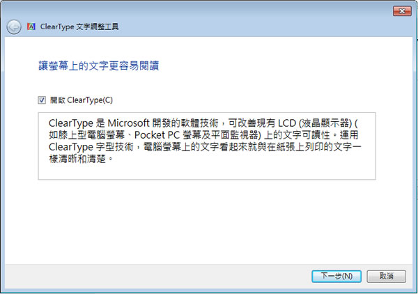 首頁操作技巧Windows 「Windows」如何使用 ClearType 文字調整工具,讓字型在 LCD 螢幕上更好看 當使用電腦時,搭配 CRT 與 LCD 顯示器上由於所使用的彩色像素點不同,所以對文字的顯示效果亦會有不同,Windows 7 有內建一個 ClearType 文字調整工具,讓我們可以調整 Windows 系統中的文字在液晶螢幕上的呈現方式,透過精靈的引導來選擇適合閱讀的字體粗細、明暗與平滑度,讓字型在 LCD 螢幕上更好看。 🔔 不錯過任何精彩! 立即訂閱我們的 LINE 官方帳號 每次發佈新文章時,您將會第一時間收到本站文章連結通知,輕鬆掌握最新資訊! 使用 LINE 追蹤文章更新 §相關文章,還可以參閱:學起來!微軟親授 10 個提升 Windows PC 效能的技巧如何升級 Windows 11 25H2?最新版本功能亮點與完整更新步驟Windows 工作列時鐘顯示秒數:真的會影響電池續航力嗎?LTT Labs 完整實測解析Windows 快速取出資料夾檔案名稱清單!內建功能輕鬆搞定,不用額外軟體Windows 11 如何縮小工作列圖示按鈕,打造更精簡桌面視覺 如何使用 Windows 7 中 ClearType 文字調整工具? 1.要開啟 ClearType 文字調整工具時,有兩種方式,點擊[開始],在搜尋框輸入「cttune.exe」或「ClearType」,然後點擊[Enter]按鍵,執行 ClearType 文字調整工具。 2.另外可以開啟[控制台] > [顯示],點擊[調整 ClearType 文字]。 3.開啟後,會先顯示 ClearType 文字調整說明,點擊[下一步]。 4.接下來會有精靈引導你回答問題,共四個步驟,回答完畢,就調整好了。