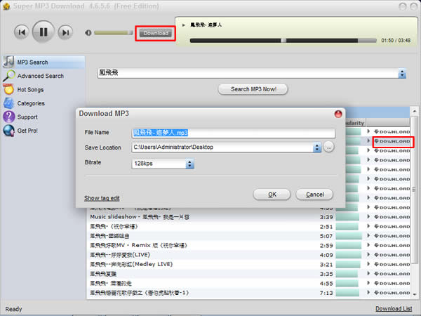 4.若想要下載回自己的電腦,請選取歌曲之後按下[DOWNLOAD]按鈕或在歌曲名稱後按下[DOWNLOAD]按鈕,設定好存檔路徑之後再按[OK]。