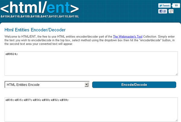 首頁線上工具開發工具 線上 HTML 符號編碼及解碼免費查詢服務 在編寫網頁的過程中,若需要用到 HTML 內碼或將內碼解析出 HTML 所代表的符號時,可以來試試這個免費的線上服務 <HTML/ENT> ,例如需要在網頁裡應用如下列的 「♠」、「◊」、「™」、「‰」、「δ」、「∫」或「∇」 等等的特殊符號或是英文字母的 Entity Name 或 Entity Number 時,只要在 <HTML/ENT> 輸入這些符號,就能幫你查詢出相對應的 Entity Number 。 🔔 不錯過任何精彩! 立即訂閱我們的 LINE 官方帳號 每次發佈新文章時,您將會第一時間收到本站文章連結通知,輕鬆掌握最新資訊! 使用 LINE 追蹤文章更新 §相關文章,還可以參閱:網站效能健檢免費工具!PageTest 多裝置模擬效能分析及由 AI 提出改進建議Regex-Vis 圖解正則表達式的線上工具,可編寫還可驗證Sitemap Generator:線上快速產生符合 SEO 標準的網站地圖,無網址數量限制適用各類型網站網站隱私權政策產生器 Privacy Policy Generator:輸入網站名稱和網址即可輕鬆生成專屬條款Frame0:輕鬆繪製應用程式流程圖、UML 和介面雛形的免費工具,適用於 macOS 與 Windows 如何使用 HTML/ENT? 1.進入 HTML/ENT 網站,將需要解碼或編碼的字符輸入後,選擇要解碼(Decode)或編碼(Encode),點擊[Decode / Encode],稍後下,便會在其下方列出編碼或解碼後的內碼。 2.以上範例。 「♠」、「◊」、「™」、「‰」、「δ」、「∫」、「∇」 網站網址:http://htmlent.com/index.php