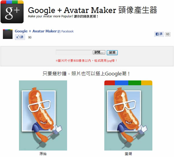 首頁線上工具影像繪圖 Google+ Avatar Maker 線上 Google+ 頭像產生器 Google+ 在最近相當熱門,各種關於 Google+ 的應用,相繼推出,Google+ Avatar Maker 就是一個應用於 Google+ 頭像的免費產生器,只需上傳你預計放在 Google+ 的個人首頁的頭像圖片,馬上就可以取得一張有 Google+ 相關的頭像照。 🔔 不錯過任何精彩! 立即訂閱我們的 LINE 官方帳號 每次發佈新文章時,您將會第一時間收到本站文章連結通知,輕鬆掌握最新資訊! 使用 LINE 追蹤文章更新 §相關文章,還可以參閱:跟著做就會!教你用 ChatGPT 製作具職業形象的漫畫風頭像Put!所見即所得的 AI 提示詞圖庫:讓你看著範例圖,複製就能做出同級作品Google 親自示範:Nano Banana AI 圖像編輯工具的 13 個熱門玩法照片角度不滿意?AI 幫你調整!3D Camera Control 讓舊照片任意變換視角Meta AI 免費帳戶也能用 Midjourney!無限生成 AI 圖片,台灣可用 如何使用 Google+ Avatar Maker? 1.進入 Google+ Avatar Maker 網站後,點擊[瀏覽]來選擇自己電腦裡的相片(※圖片尺寸要800像素以內,格式限用jpg),選擇好之後,按下[變潮]的按鈕。 2.稍後下,便可轉換完成,點擊[按這裡]便可下載回自己的電腦裡。 3.範例。 Google+ Avatar Maker網站網址:http://gplus.orinx.com/