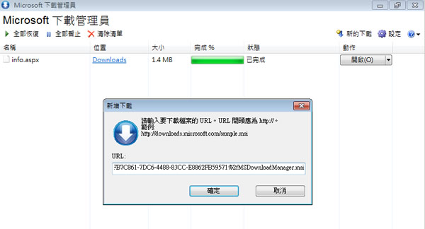 首頁電腦軟體上傳下載 「Microsoft 下載管理員」輕鬆管理你的網路下載項目 Microsoft 下載管理員 - 是由微軟所開發的免費工具,可用於輕鬆管理你的網路下載項目,不過 Microsoft 下載管理員 僅支援 Http 的通訊協定,開始下載後,Microsoft 下載管理員 容易使用的介面會顯示下載作業的狀態,並可暫停執行中的下載作業或繼續失敗的下載作業。 🔔 不錯過任何精彩! 立即訂閱我們的 LINE 官方帳號 每次發佈新文章時,您將會第一時間收到本站文章連結通知,輕鬆掌握最新資訊! 使用 LINE 追蹤文章更新 §相關文章,還可以參閱:ArrowDL 全平台下載利器:輕鬆批量下載 YouTube、BT、FB與多站串流影片YouTubePlaylistDownloader 支援播放清單與頻道的 YouTube 影片下載工具,還能轉換格式Parabolic 讓 yt-dlp 更好用的免費影音下載工具,支援上千個網站的影音下載Hasleo Windows ISO Downloader 幫你從微軟網站下載原版 Windows ISO 檔XMusicDownloader 從音樂網站搜尋並下載歌曲的免費應用程式 如何使用「Microsoft 下載管理員」? 1.下載、安裝(必須具有電腦的系統管理存取權才能安裝 Microsoft 下載管理員),安裝完成後,開啟程式主介面,若要開始下載,可複製下載的檔案網址,並按下[新的下載]按鈕,在其所出現的對話視窗,貼上剛剛所複製的檔案網址後,點擊[確定],便會開始下載任務,下載期間可以暫停或恢復。 (Microsoft 下載管理員 僅支援 Http 的通訊協定) 2.可點擊右上角的[設定],可設定檔案下載後的儲存路徑、連線數上限...等等。 Microsoft 下載管理員版本:1.2.1語言:繁體中文(多國語言)性質:免費適用:Windows官方網站:http://www.microsoft.com/zh-tw/download/details.aspx?id=27960下載:按我下載