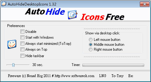 首頁電腦軟體視窗桌面 AutoHideDesktopIcons 定時自動隱藏桌面及工具列上的圖示(免安裝版) 如果使用的是屬於公用電腦又特別受不了桌面上被擺放著一堆的檔案或軟體捷徑時,可以來試試這套 AutoHideDesktopIcons免費又免安裝的工具軟體,可以自訂當滑鼠不在桌面上的時間來自動將桌面或工具列上的圖示隱藏起來,等到要用的時候,再呼叫出圖示出來應用,如此一來當自己使用時,桌面不會顯示一堆跟自己無關的檔案圖示,又保留原有的桌面圖示。 🔔 不錯過任何精彩! 立即訂閱我們的 LINE 官方帳號 每次發佈新文章時,您將會第一時間收到本站文章連結通知,輕鬆掌握最新資訊! 使用 LINE 追蹤文章更新 §相關文章,還可以參閱:Windows 官方桌布商店來了!超過 400 款風格包,從遊戲到國家公園通通有微軟 City Art Search 自動將 10400多幅世界名畫設置成 Windows 鎖定螢幕畫面Digital Clock 4 可靈活自訂的桌面時鐘,支援報時、計時器、鬧鐘等多款附加套件TrafficMonitor 在 Windows 桌面上顯示網路上傳與下載的即時網速「免費下載」故宮博物院 2023 兔年月曆桌布 如何使用 AutoHideDesktopIcons? 1.下載、解壓縮,執行「AutoHideDesktopIcons.exe」便可開啟。 2.開啟後,可參照如下的說明來操作,圖中的 30Sec 是當滑鼠不再桌面上 30秒時(可自訂),便隱藏圖示,其他可參閱如下的說明,可視需要來勾選: 3.隱藏後的桌面。 AutoHideDesktopIcons版本:5.88語言:英文性質:免費適用:Windows官方網站:http://www.softwareok.com/?seite=Microsoft/AutoHideDesktopIcons下載:按我下載