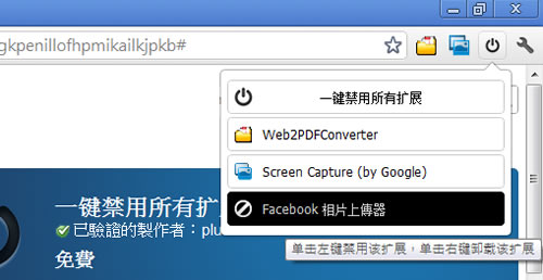 首頁瀏覽器擴充功能網頁瀏覽 快速啟用 / 停用 / 移除 Google Chrome 已安裝的全部擴充套件 Google 的 Chrome 是個相當好用的網路瀏覽器,除了穩定、載入速度快之外,就是有一堆相當實用又免費的擴充套件可供使用,不過擴充套件裝多了,常有因擴充套件的問題而造成載入速度變慢或是瀏覽器不穩定,雖然 Google Chrome 也有提供擴充套件的管理功能,但若安裝「一鍵禁用所有擴展 - 加強版」將會更方便的管理啟用 / 停用 / 移除 Google Chrome 已安裝的全部擴充套件。 🔔 不錯過任何精彩! 立即訂閱我們的 LINE 官方帳號 每次發佈新文章時,您將會第一時間收到本站文章連結通知,輕鬆掌握最新資訊! 使用 LINE 追蹤文章更新 §相關文章,還可以參閱:Font Finder & Style Detector 網頁字型搜尋與樣式偵測器,免費瀏覽器擴充功能MarkX 將網頁所選文字內容儲存成書籤,提供關鍵字搜尋功能U-Eyes 移動設備瀏覽網站模擬器,可擷取網頁成圖片與錄製螢幕Live CSS Tester 在任何網頁注入 CSS 進行即時測試Quick History 以網站角度快速檢視該網站的瀏覽紀錄(瀏覽器擴充功能) 如何使用 「一鍵禁用所有擴展 - 加強版」? 1.使用 Google Chrome 瀏覽器進入安裝網址,點擊[安裝]。 2.安裝好之後,右上角就會出現提示。 3.點擊剛剛所安裝的按鈕,即可在選單選擇停用全部擴充套件或按左鍵停用指定擴充套件,被停用的擴充套件會變成黑色的,再按一下就恢復運作,相當方便! 4.若要移除某個擴充套件,可在其套件名稱上使用滑鼠右鍵點擊,出現確認訊息時再點擊[確定]按鈕,便可移除該擴充套件,相當方便。 一鍵禁用所有擴展 - 加強版性質:免費官方網站:https://chrome.google.com/webstore/detail/ejhdjfmkegkpenillofhpmikailkjpkb