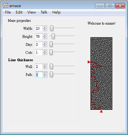 首頁電腦軟體益智遊戲 amaze 迷宮產生器 迷宮估計是每個人都玩過的遊戲,若想要自己設計一個紙上迷宮遊戲,可以來試試 amaze 這套免費的迷宮圖產生器,可以產生出不同形狀、大小以及複雜度的迷宮,產生後的迷宮還可以匯出成為圖檔或是直接從程式中列印出來讓小朋友或是自己來打發時間喔! 🔔 不錯過任何精彩! 立即訂閱我們的 LINE 官方帳號 每次發佈新文章時,您將會第一時間收到本站文章連結通知,輕鬆掌握最新資訊! 使用 LINE 追蹤文章更新 §相關文章,還可以參閱:Retr0Mine:免安裝經典踩地雷遊戲,可選挑戰難易度「象棋巫師」大師級的免費象棋遊戲(免安裝版)用 Excel 玩 Angry Birds用 Excel 玩俄羅斯方塊bpuzzle 好玩的拼圖遊戲 如何使用amaze 迷宮產生器? 1.安裝開啟 amaze 迷宮產生器後,在 Maze properties 處,可以設定迷宮的相關參數,像是迷宮的 Width - 寬、Height - 高、Stay 及 Cuts 數值越大迷宮也就會越複雜;在 Wall 可設定迷宮牆壁的厚度、Path 則可設定正確路線的寬度,每做變更後均可在右側圖中及時檢視;若想在原參數更換迷宮的圖形,可直接使用滑鼠按圖形,便可變換。 2.可在上方功能表[Edit] > 變化迷宮內的線條圖形。 3.點擊[View] > [Show Path]勾選後,可使迷宮顯示正確的路線;要將迷宮匯出成圖檔,可點擊[File] > [Export...];若要直接列印可點擊[File] > [Print]。 amaze版本:1.1-22語言:英文性質:免費適用:Windows官方網站:http://sourceforge.net/projects/qtamaze/下載:按我下載